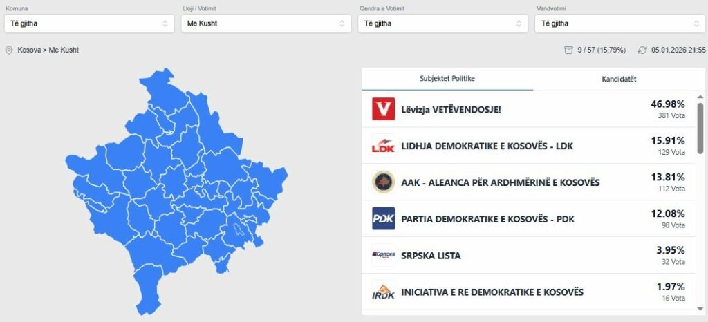 With more than 15% of the conditional votes counted so far, the Vetëvendosje Movement is in the lead with 64.98%, or 381 votes, reports Rks News.