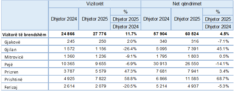 Meanwhile, the number of foreign visitors increased by 2.5 percent compared to December 2024. In total, Kosovo was visited by 40,517 foreign tourists in December 2025, with the largest numbers coming from Albania, Germany, Switzerland, and Turkey.