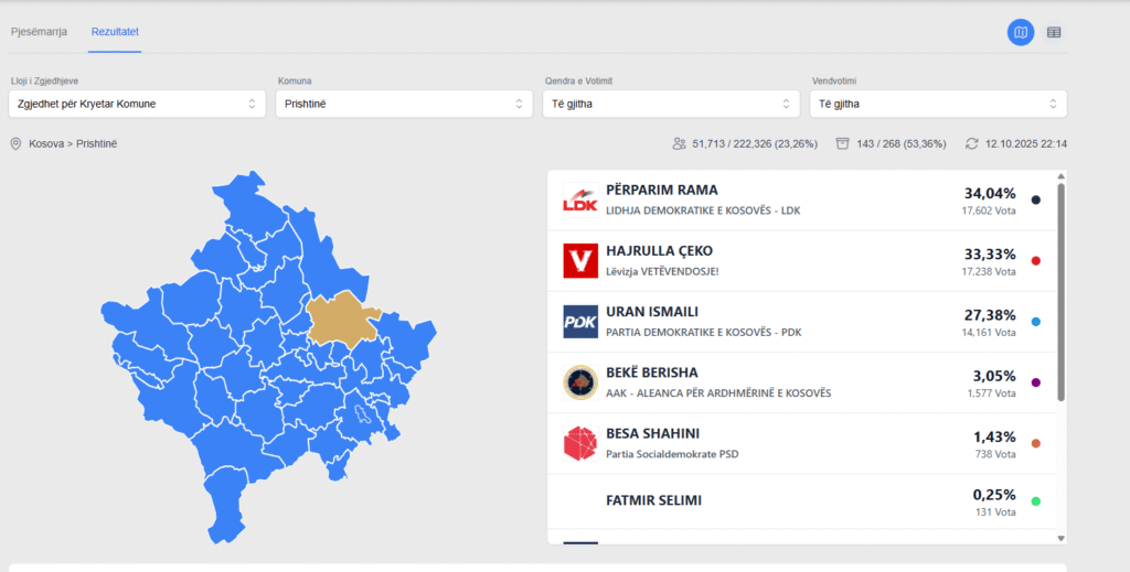 According to data released by the Central Election Commission (CEC), Përparim Rama currently leads with 34.04%, closely followed by Hajrulla Çeku with 33.33%.