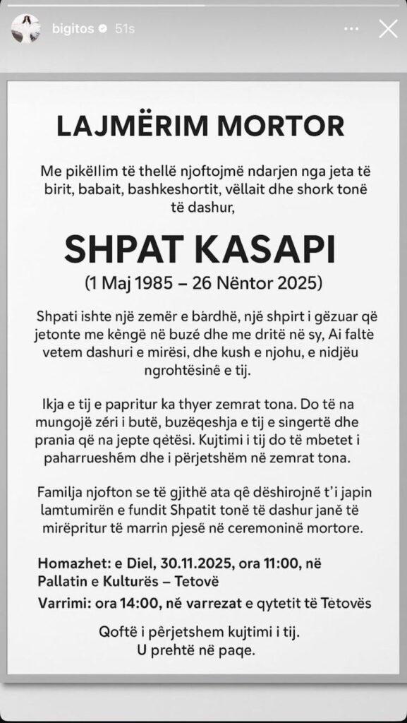 The memorials in honor of Shpat Kasapi—remembered as “a pure heart, a joyful soul”—will be held tomorrow according to the following schedule: