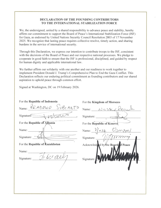 “We, the undersigned, united by a shared responsibility to advance peace and stability, hereby affirm our commitment to support the Peace Board’s International Stabilization Force (ISF) for Gaza, as endorsed by United Nations Security Council Resolution 2803 of 17 November 2025. We recognize that sustainable peace requires collective resolve, timely action, and burden-sharing in the service of international security.”