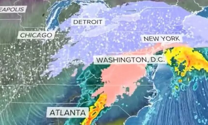 By around 6:00 p.m. ET, warmer Atlantic air is expected to penetrate the I-95 corridor, causing frequent transitions between snow, freezing rain, sleet, and rain, while New England is expected to receive heavy snowfall.