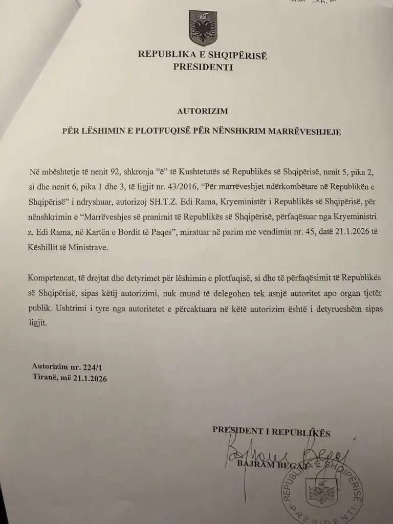 The President of the Republic, Bajram Begaj, has today authorized Prime Minister Edi Rama to sign the agreement for Albania’s accession to the Charter of the Peace Board, an international initiative aimed at promoting stability and peace in conflict-affected regions.