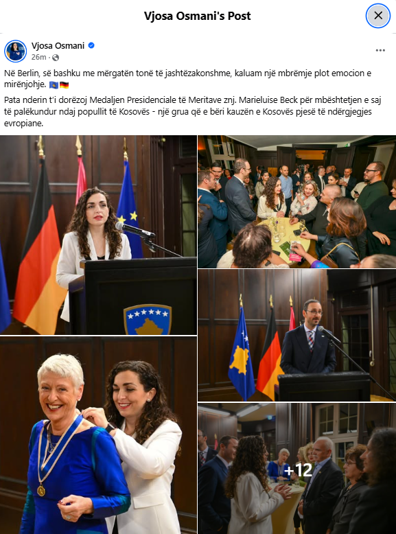 “Ms. Beck is a woman who made the cause of Kosovo a part of European conscience,” Osmani emphasized, praising her dedication to the country and to the Kosovar community in the diaspora.