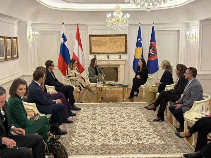 The President of the Republic of Kosovo, Vjosa Osmani, hosted two senior European officials this evening: Austria’s Federal Minister for Europe, Integration, and Family, Claudia Plakolm, and Slovenia’s State Secretary for European Affairs and Economic Diplomacy, Neva Grašiq.