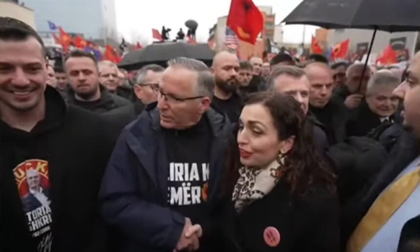 During the march, Osmani greeted Bedri Hamza, the head of the Democratic Party of Kosovo, and Endrit Thaçi, the son of former President Hashim Thaçi.