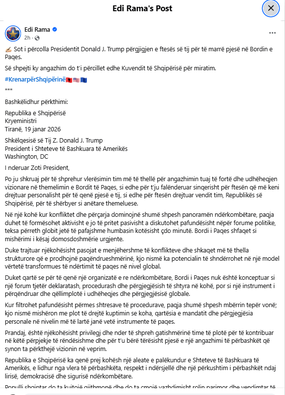 Albanian Prime Minister Edi Rama has published his response to President Donald Trump following the invitation he received to become a member of the Peace Board.