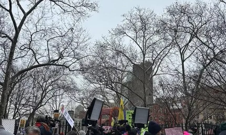 The area has become crowded, while media crews have gathered around the chanting protesters.