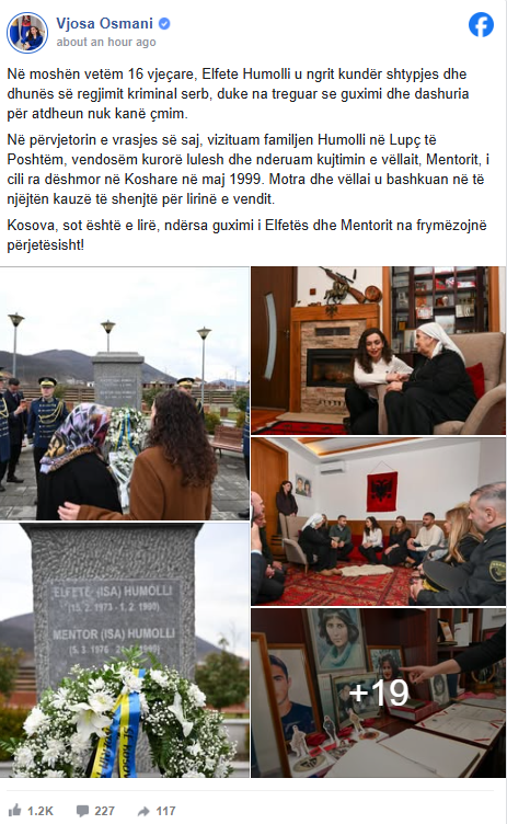 President Osmani emphasized that the sacrifice and courage of Elfete and Mentor are a lasting inspiration for all citizens of Kosovo and reflect their boundless love for the freedom of the country.