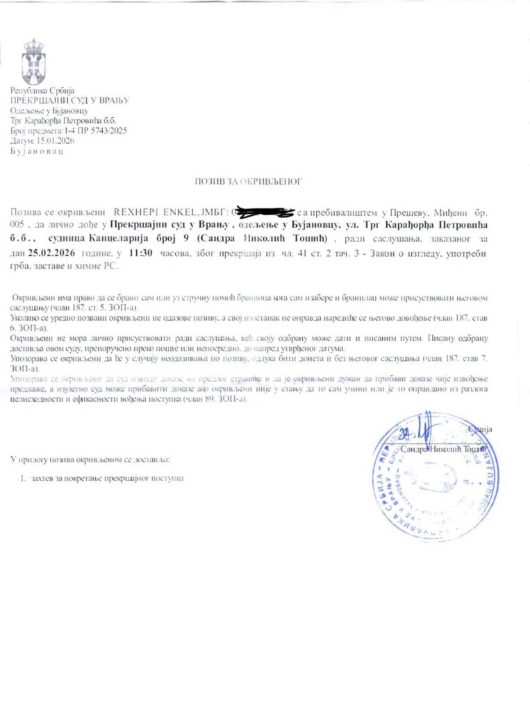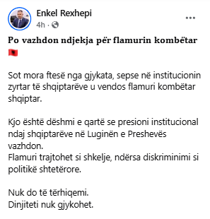 The Chairman of the Albanian National Council, Enkel Rexhepi, announced that he received a summons today from the Serbian court regarding the display of the Albanian national flag at the official institution representing Albanians in the Presheva Valley.
