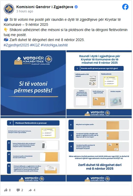 “How to vote by mail for the second round of municipal mayoral elections – November 9, 2025. Check the guidelines and learn how to complete and send your ballot by post. The envelope must be sent no later than November 8, 2025,” the CEC announcement stated.