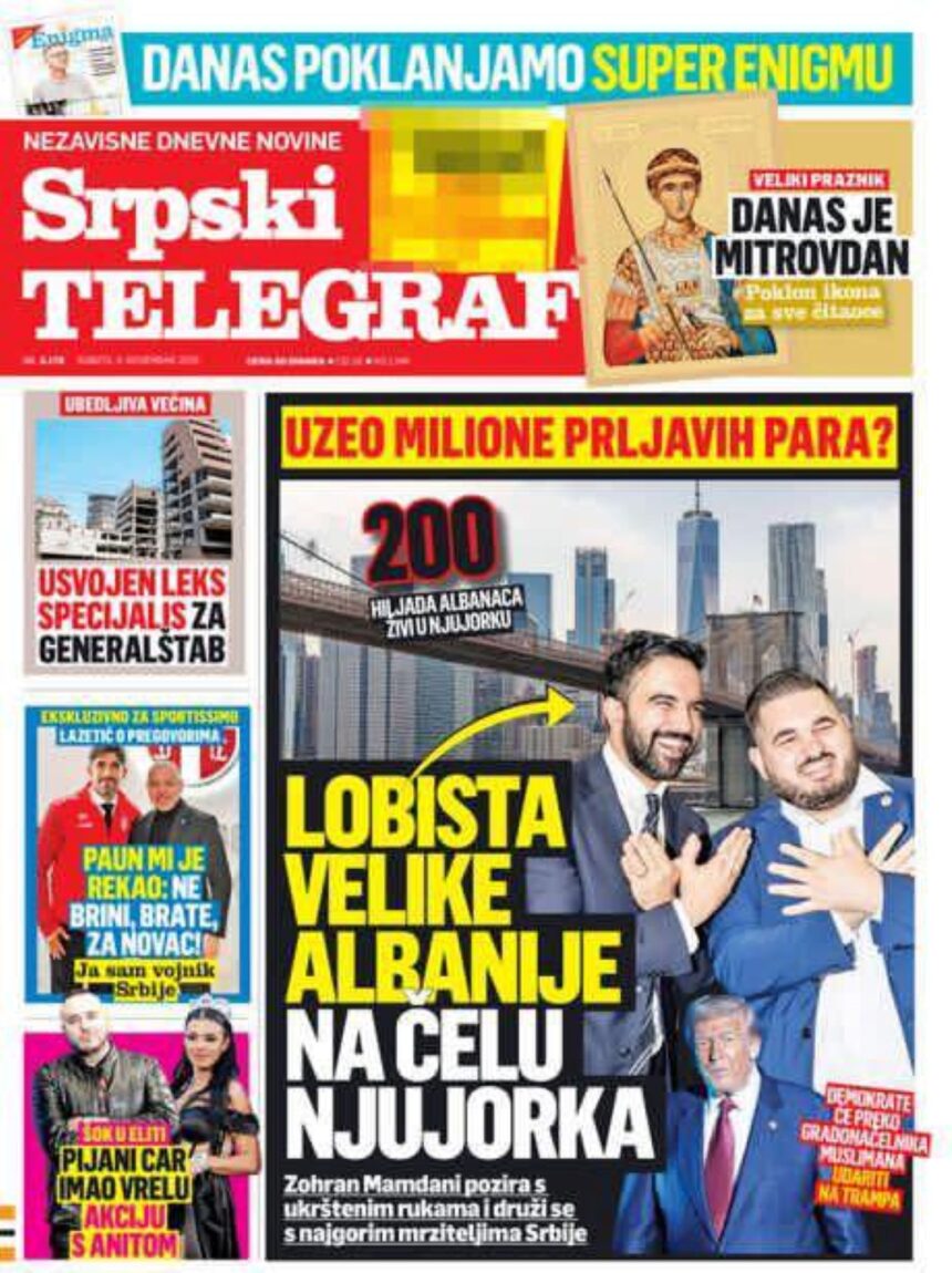The Serbian outlet “Telegraf” has described Zohran Mamdani, the newly elected Mayor of New York, as a “lobbyist for Greater Albania” after a photograph surfaced showing him making the Albanian double-headed eagle hand gesture — a traditional symbol of Albanian identity and unity.