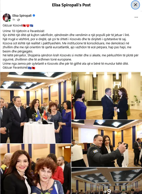 Albanian Foreign Minister Elisa Spiropali congratulated Kosovo on the 18th anniversary of independence.