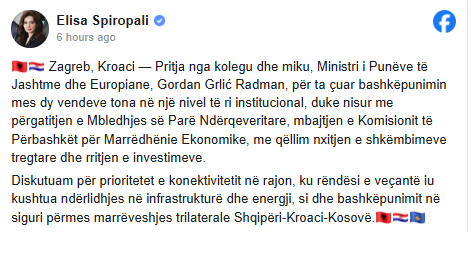 Spiropali stated that she and the Croatian minister discussed regional connectivity priorities, “with special emphasis on infrastructure and energy interconnection, as well as cooperation in the field of security through the trilateral agreement Albania–Croatia–Kosovo.”