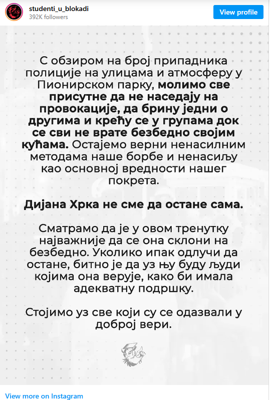 As tensions continue to mount in Belgrade, the Students in the Blockade movement issued another public statement late tonight, reaffirming their commitment to non-violence and expressing solidarity with Dijana Hrka, who remains on hunger strike in front of the Serbian Parliament despite escalating police presence and provocations by pro-government groups.