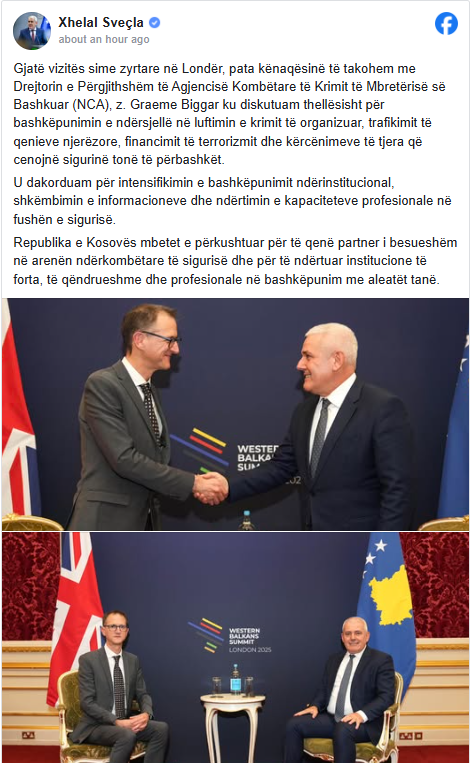 Acting Minister of Internal Affairs, Xhelal Sveçla, during an official visit to London, met with the Director-General of the United Kingdom’s National Crime Agency (NCA), Graeme Biggar, to discuss mutual cooperation in combating organized crime, human trafficking, terrorism financing, and other threats to shared security.