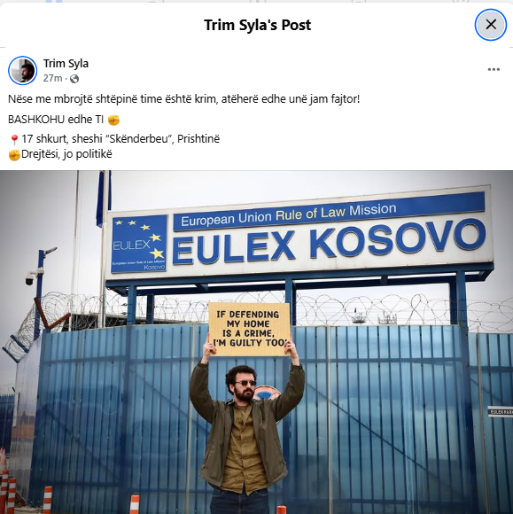 In his public post, Syla called on citizens to join the civic march for justice, “Justice, Not Politics,” scheduled for February 17 in Prishtina, organized by the movement Liria ka Emër, in defense of the KLA veterans in The Hague.