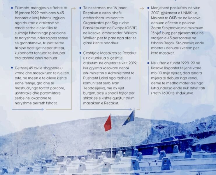On the anniversary of the massacre, former OSCE Ambassador William Walker is expected to publish his book titled “Racak”, sponsored by the Government of Kosovo. Walker wrote the book based on his personal experience as a witness to the massacre, as he stated, “before I go to the other world.”
