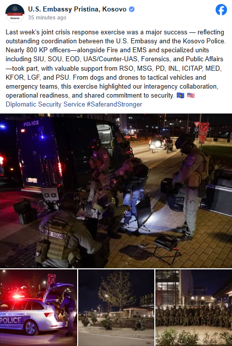 “Last week’s joint crisis response exercise was a major success—reflecting the excellent coordination between the U.S. Embassy and the Kosovo Police. Nearly 800 Kosovo Police officers—along with firefighters and emergency responders and specialized units including SIU, SOU, EOD, UAS/Counter-UAS, Forensics, and Public Affairs—participated, with valuable support from RSO, MSG, PD, INL, ICITAP, MED, KFOR, LGF, and PSU. From dogs and drones to tactical vehicles and emergency teams, this exercise highlighted our interagency cooperation, operational readiness, and shared commitment to security,” the Embassy wrote in its statement.
