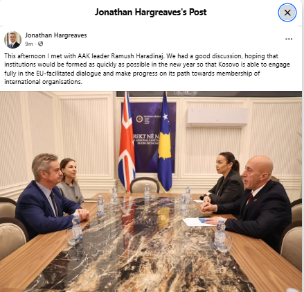 Hargreaves stated that he discussed with Haradinaj the importance of forming Kosovo’s new institutions as soon as possible in the new year.