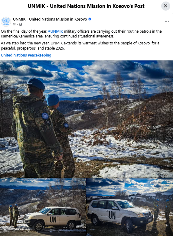 In a statement posted on Facebook, UNMIK said: “As we enter the new year, UNMIK extends its warmest wishes to the people of Kosovo for a peaceful, prosperous, and sustainable year 2026.”