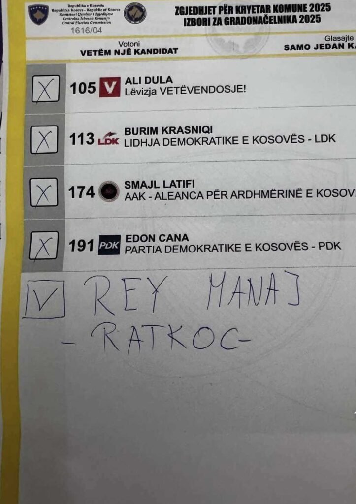 Instead of selecting a candidate, the citizen wrote the name of Albanian footballer Rey Manaj on the ballot. This happened just one day after Manaj scored a goal against Serbia.