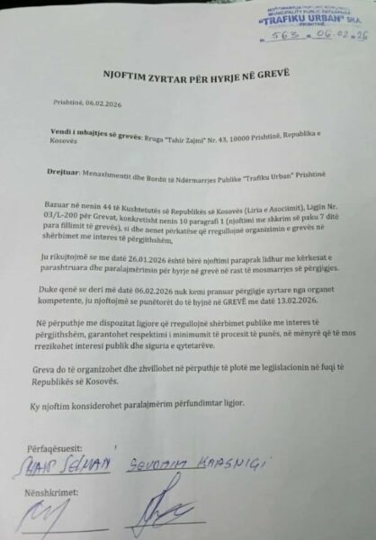 According to a document published by Telegrafi, reportedly submitted to the enterprise’s management, the workers stated that they submitted a preliminary strike notice on January 26, 2026, but as of February 6, they had not received any response from the competent authorities.