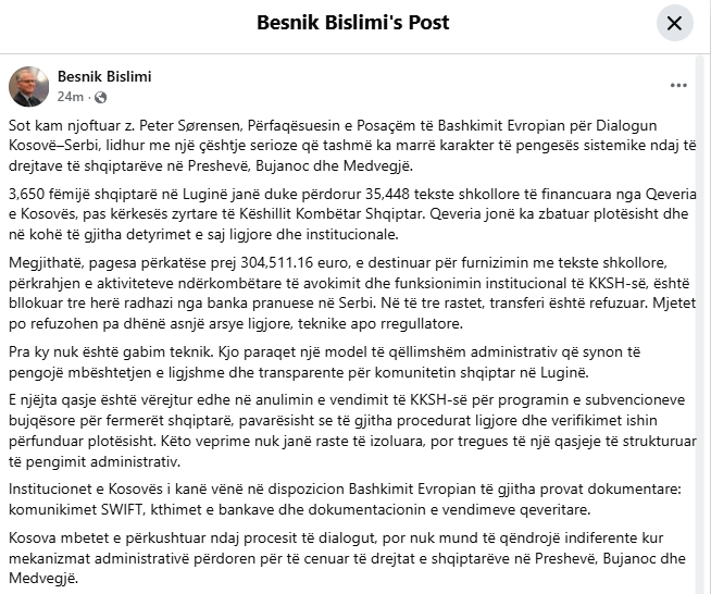 According to Bislimi, Serbian authorities have blocked three consecutive payments intended for the provision of school textbooks and the institutional support of the Albanian National Council, amounting to €304,511.16.