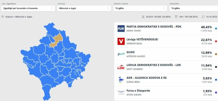 Guxo ranks third with 12.89% (3,819 votes), followed by the Democratic League of Kosovo (LDK) with 11.94% (3,538 votes).