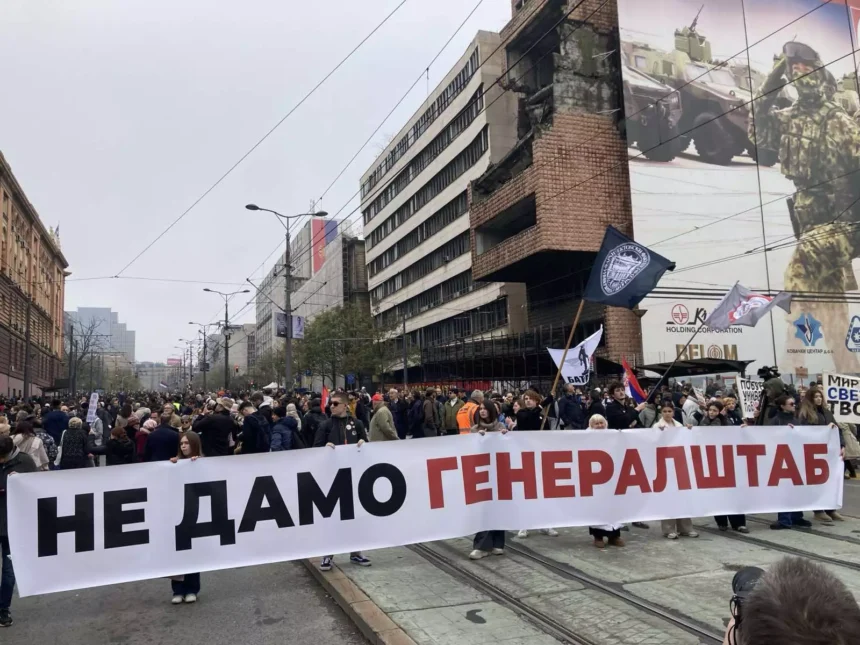Students from several Belgrade faculties and the initiative Ansambl Generalštab gathered in front of the General Staff building, warning the government that they will defend this symbol of Belgrade with their bodies if authorities proceed with demolition plans. The protest carried the slogan “We are a living wall”.