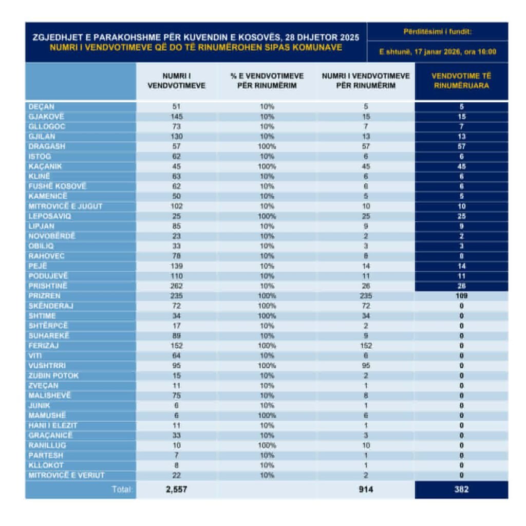 From the start of this process until now (Saturday, January 17, 2026, at 16:00), 382 out of 914 polling stations have been recounted. These polling stations belong to the following municipalities: Deçan (5/5), Gjakovë (15/15), Gllogoc (7/7), Gjilan (13/13), Dragash (57/57), Istog (6/6), Kaçanik (45/45), Klinë (6/6), Fushë Kosovë (6/6), Kamenicë (5/5), South Mitrovica (10/10), Leposaviq (25/25), Lipjan (9/9), Novobërdë (2/2), Obiliq (3/3), Rahovec (8/8), Pejë (14/14), Podujevë (11), Prishtina (26/26), and Prizren (109/235).
